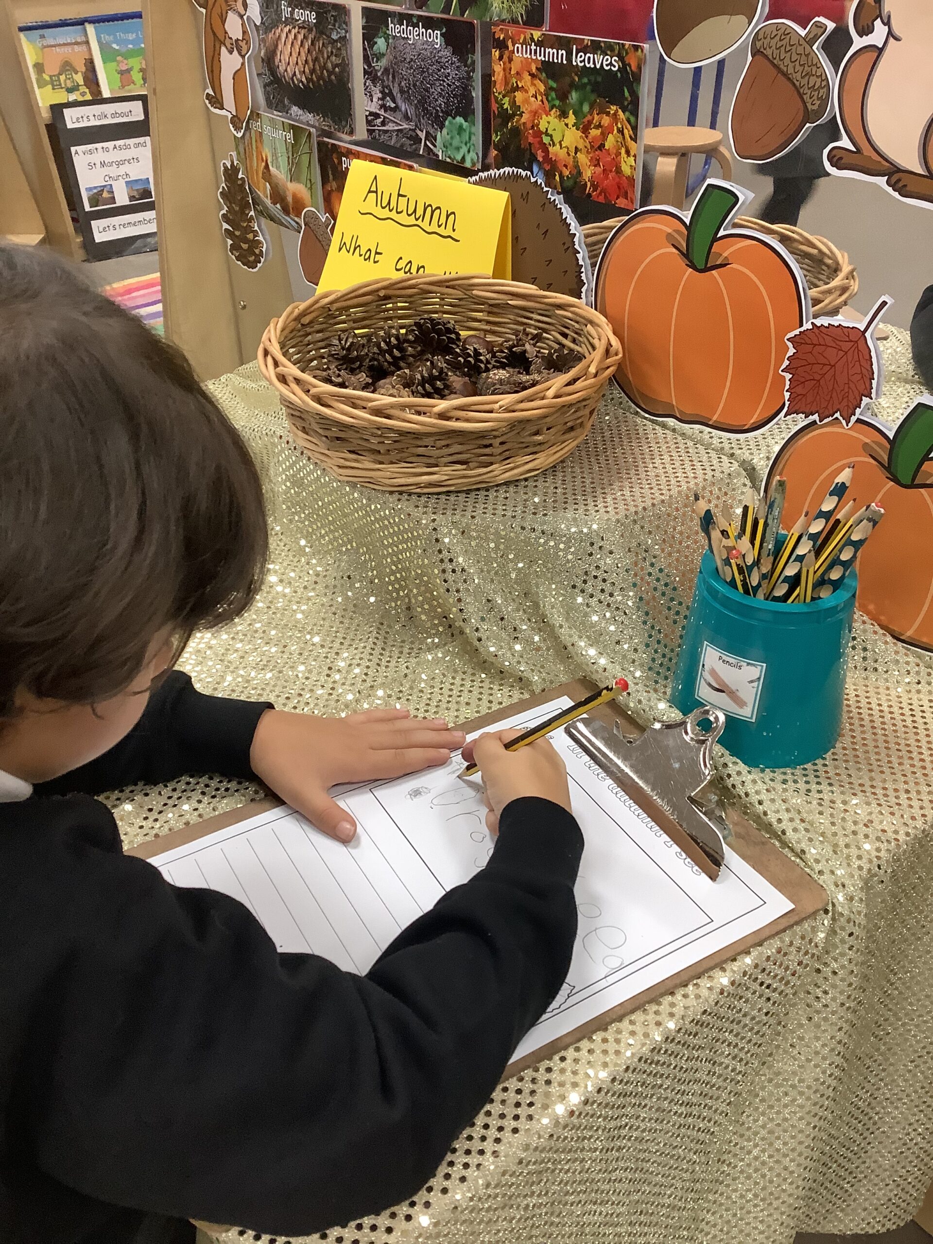 This week in Reception we have been investigating what happens in the Autumn. Our story is about a busy little squirrel who is collecting food for the winter. We have been doing some observational drawing and finding out lots of other Autumn facts!