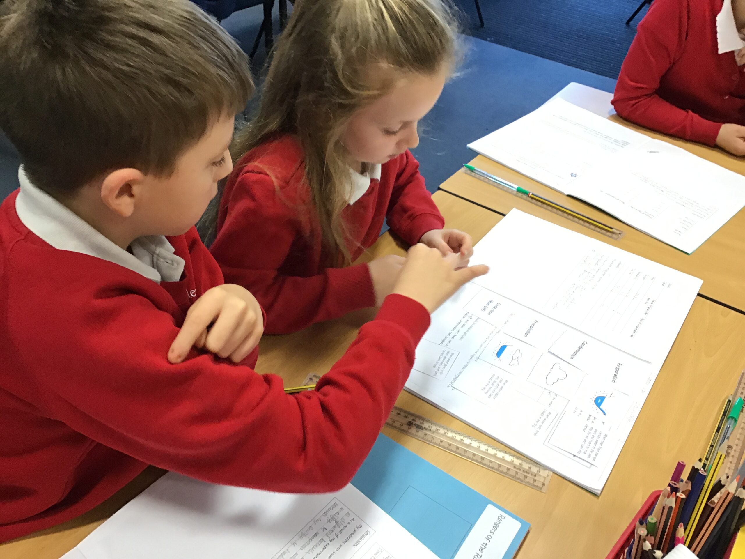 In science, the children in class 13 have been learning about the water cycle. We learnt that all water is recycled and that it cycles round continuously. Ask us about the meaning of the following words: evaporation, condensation, precipitation and run off.